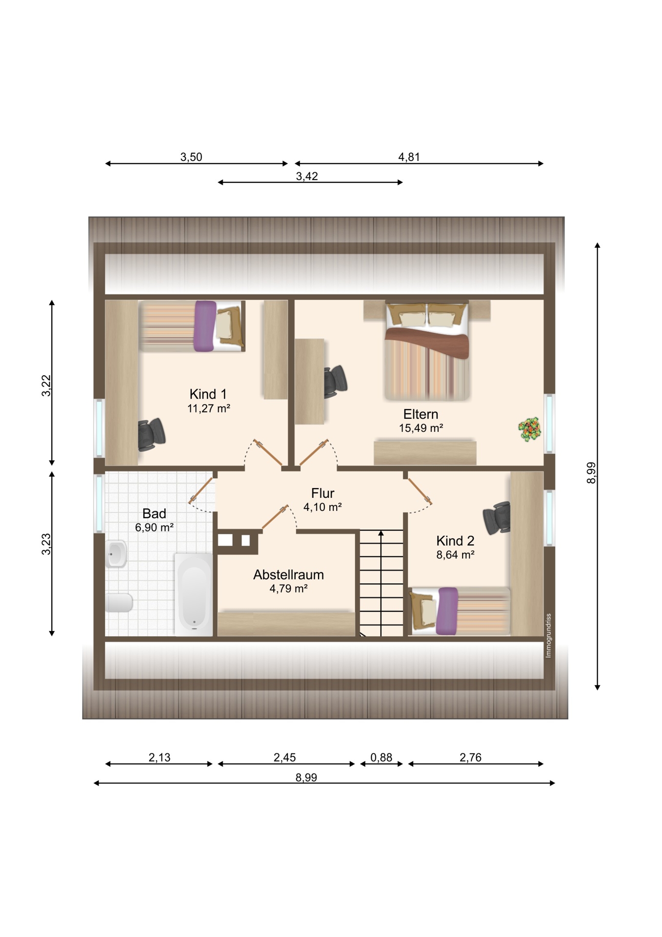 Über die massive Treppe gelangen Sie in das Dachgeschoss, unter dem sich ein zusätzlicher Abstellraum befindet. Oben erwarten Sie zwei Kinderzimmer sowie ein großzügiges Schlafzimmer. Das Badezimmer mit Badewanne befindet sich noch im ursprünglichen Zustand, bietet jedoch viel Platz zur individuellen Gestaltung. Ein weiterer Abstellraum mit ca. 5 m² rundet das Raumangebot auf dieser Ebene ab.