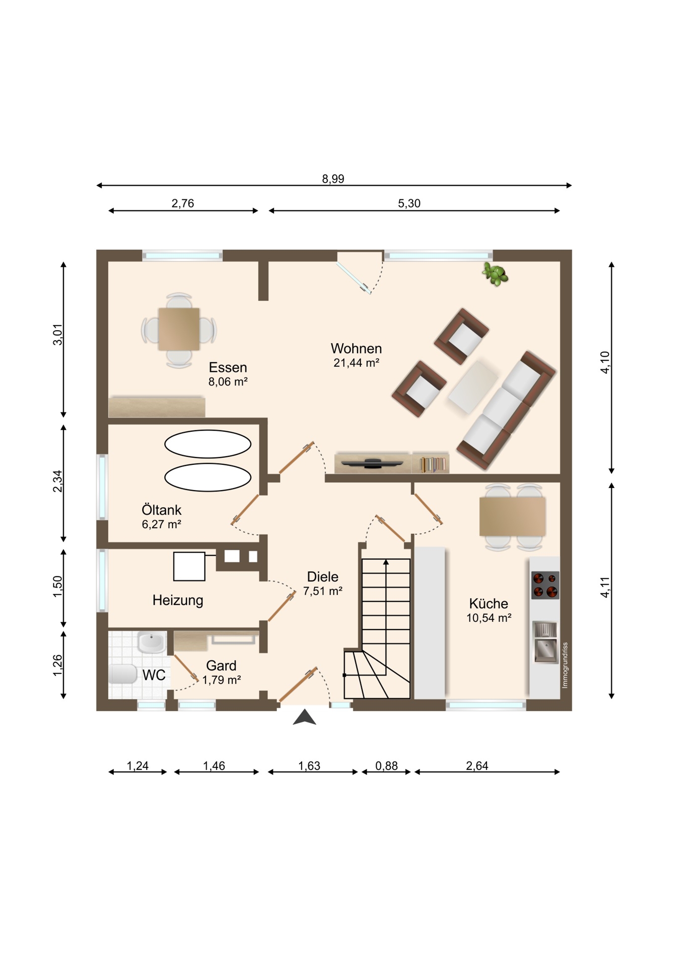 Bereits in der Diele werden Sie empfangen, von der aus alle Räume des Erdgeschosses erreichbar sind. Hier befindet sich zunächst das Gäste-WC mit vorgelagerter Garderobe. Direkt daneben liegt der Heizungsraum, in dem die Ölheizung (Baujahr 2000) untergebracht ist. Angrenzend befindet sich ein separater Tankraum mit zwei Öltanks à 1.500 Litern.