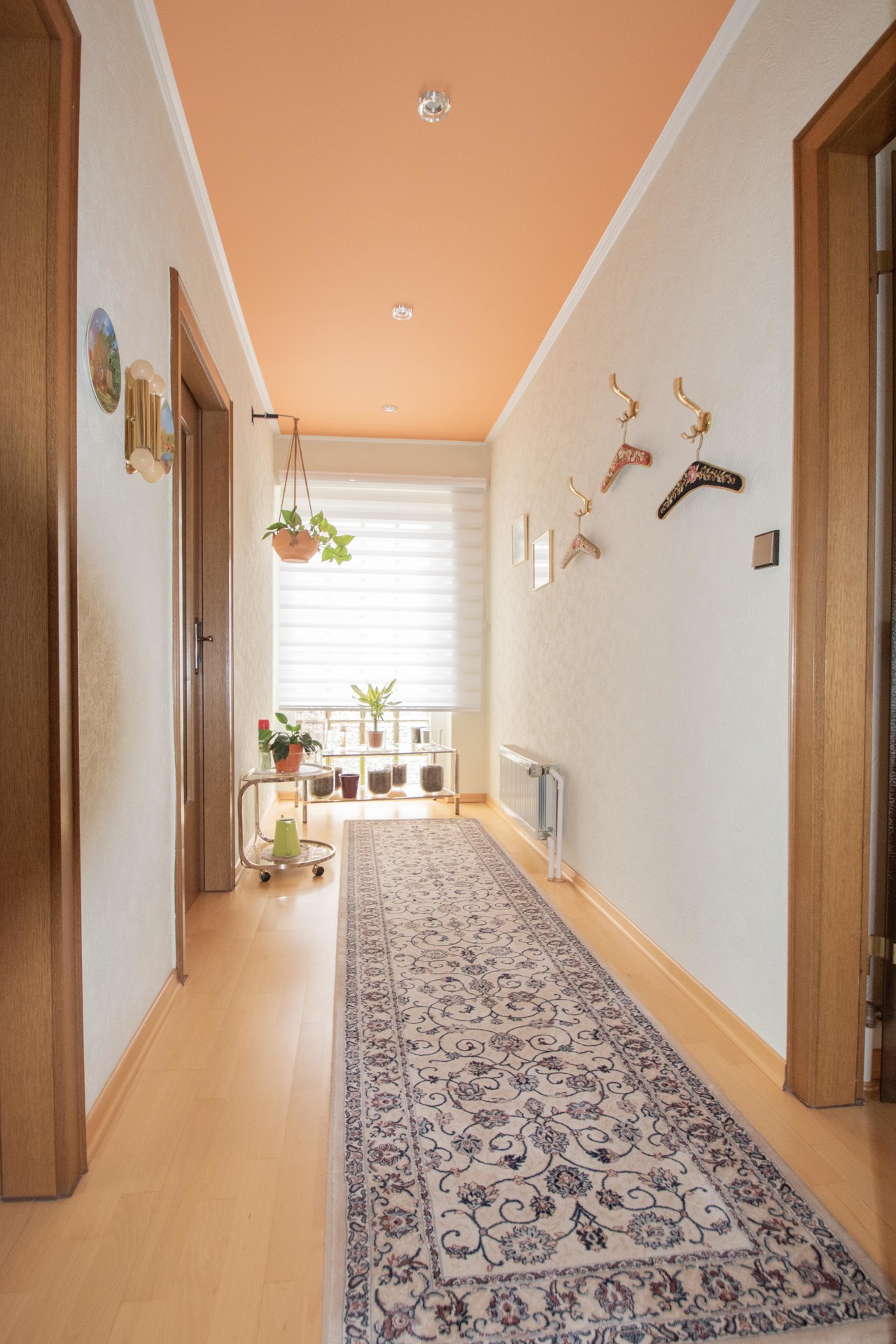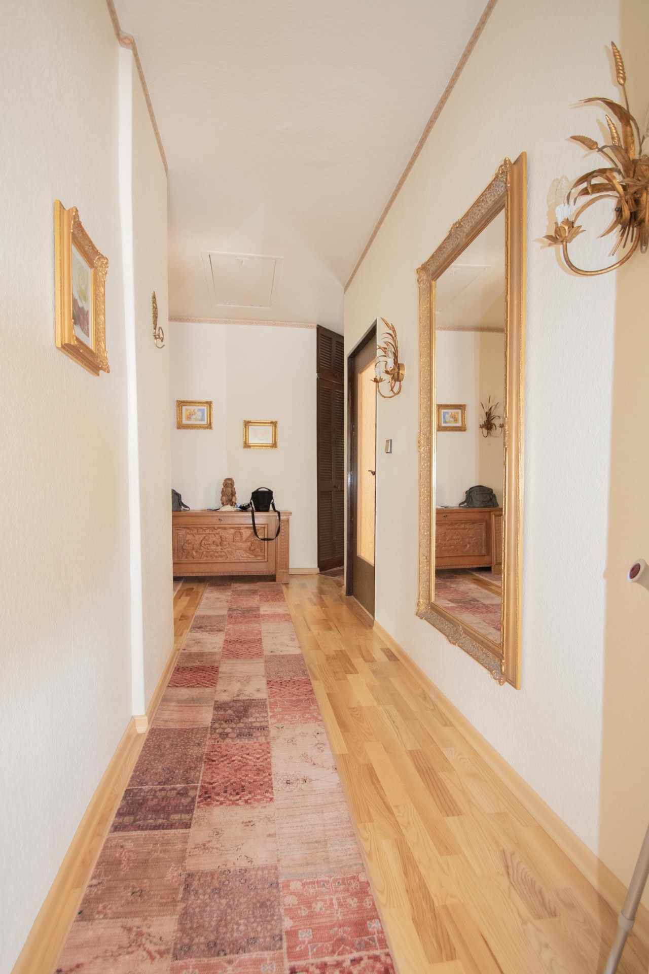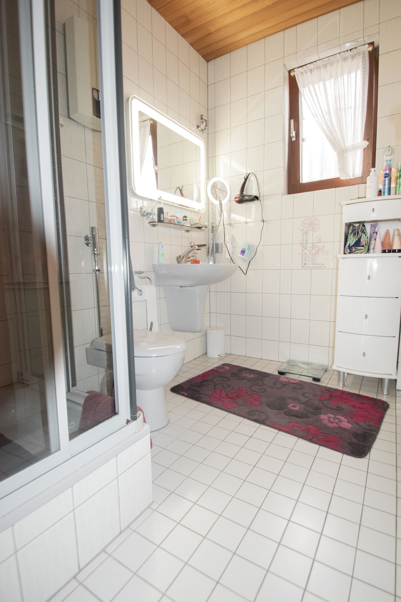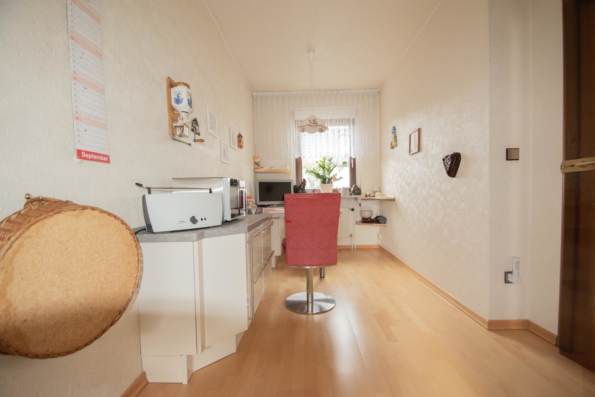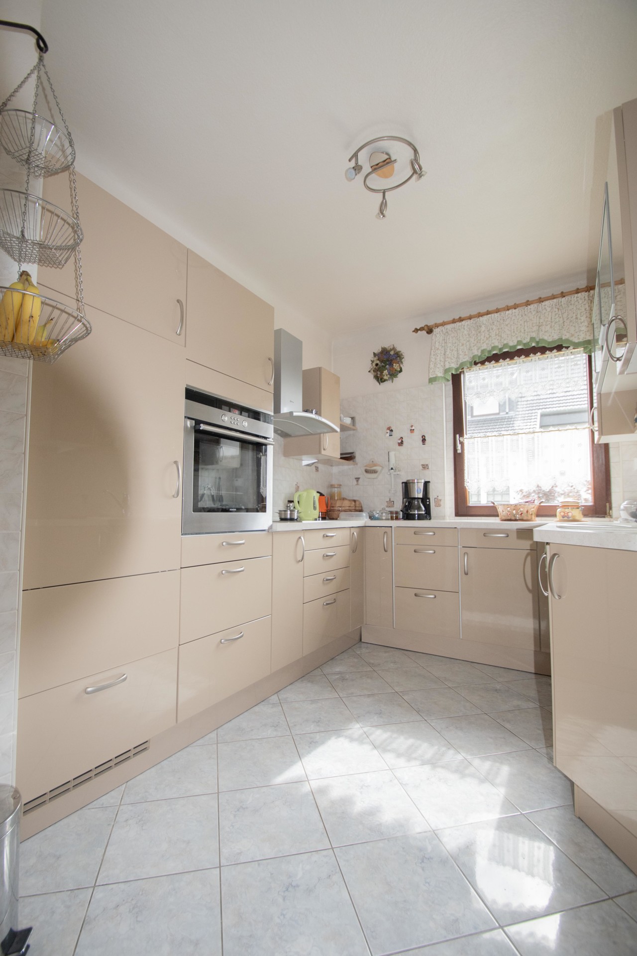 Zurück im Flur führt ein weiterer Weg zur Küche, die mit einer modernen Hochglanz-Einbauküche ausgestattet ist. Hier befindet sich der Durchbruch zwischen den Häusern. Die Küche bietet einen Backofen auf Oberkörperhöhe und ausreichend Stauraum. Vom Flur aus gelangt man auch in ein Duschbad mit elektrischem Handtuchheizkörper sowie in zwei weitere Zimmer, die derzeit als Schlafzimmer und Wohnzimmer genutzt werden. Dieser Teil des Hauses wurde 1996 mit einer Perlite-Schüttung gedämmt und hat Plameco-Spanndecken mit Lichtspots.
