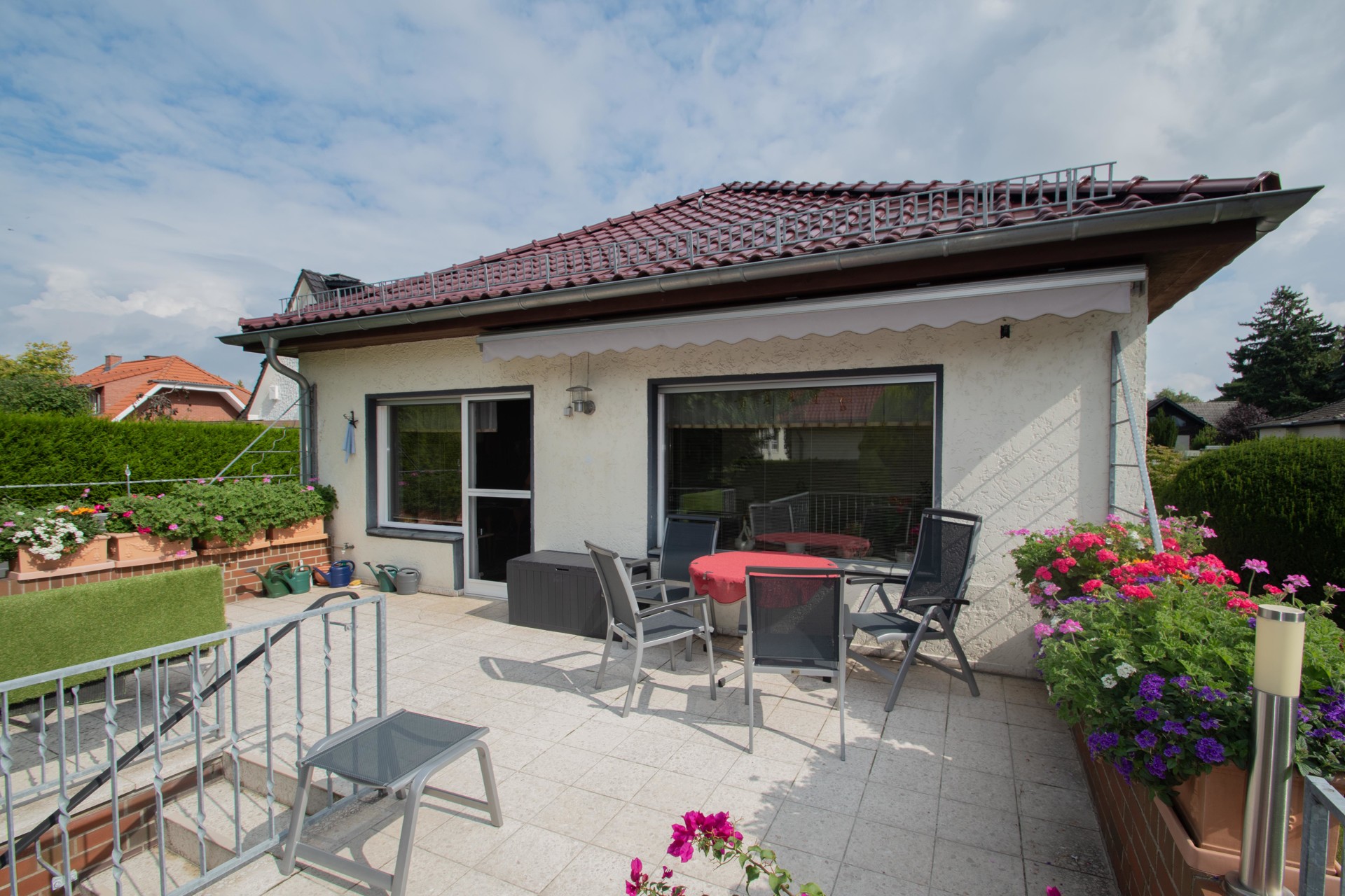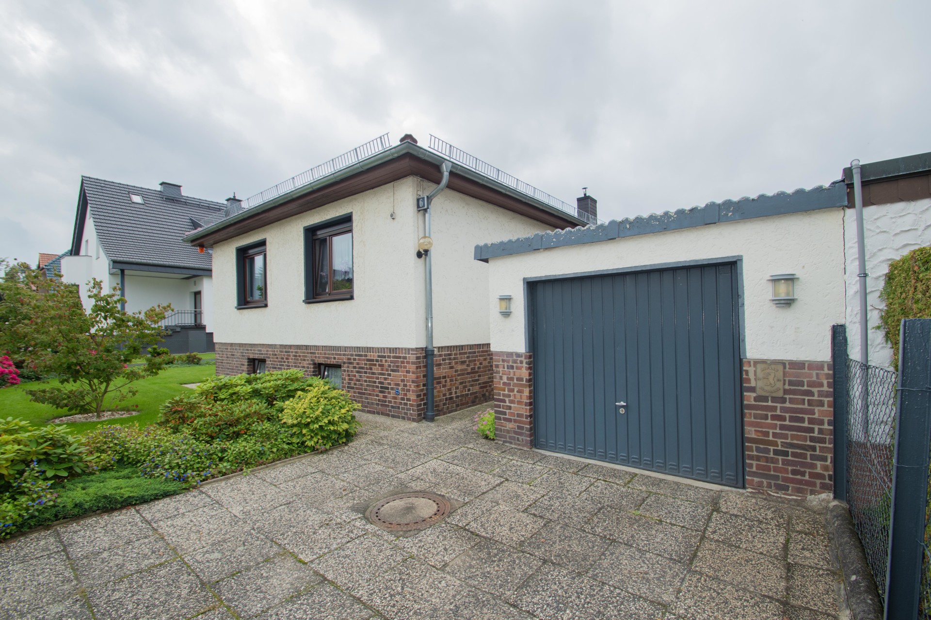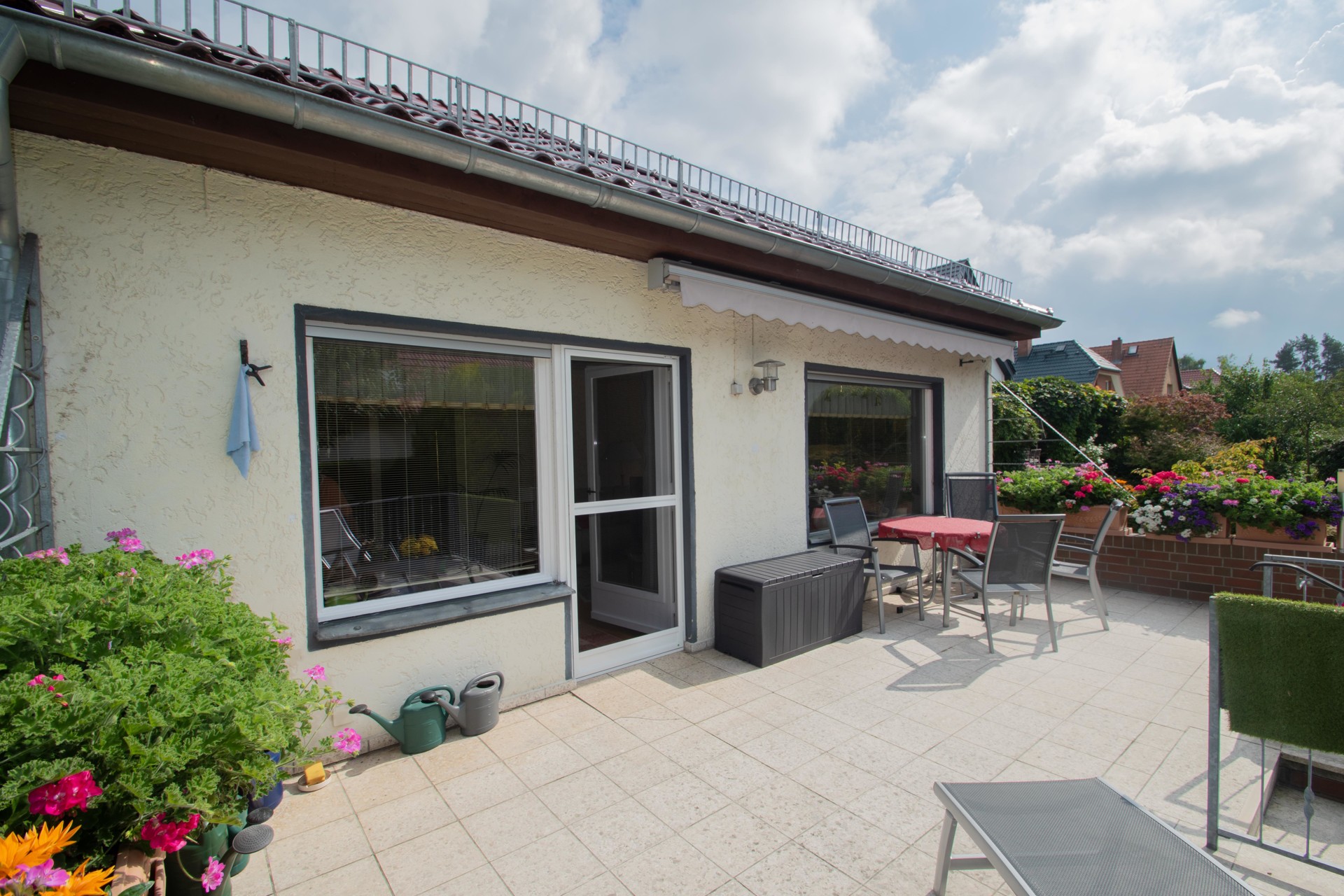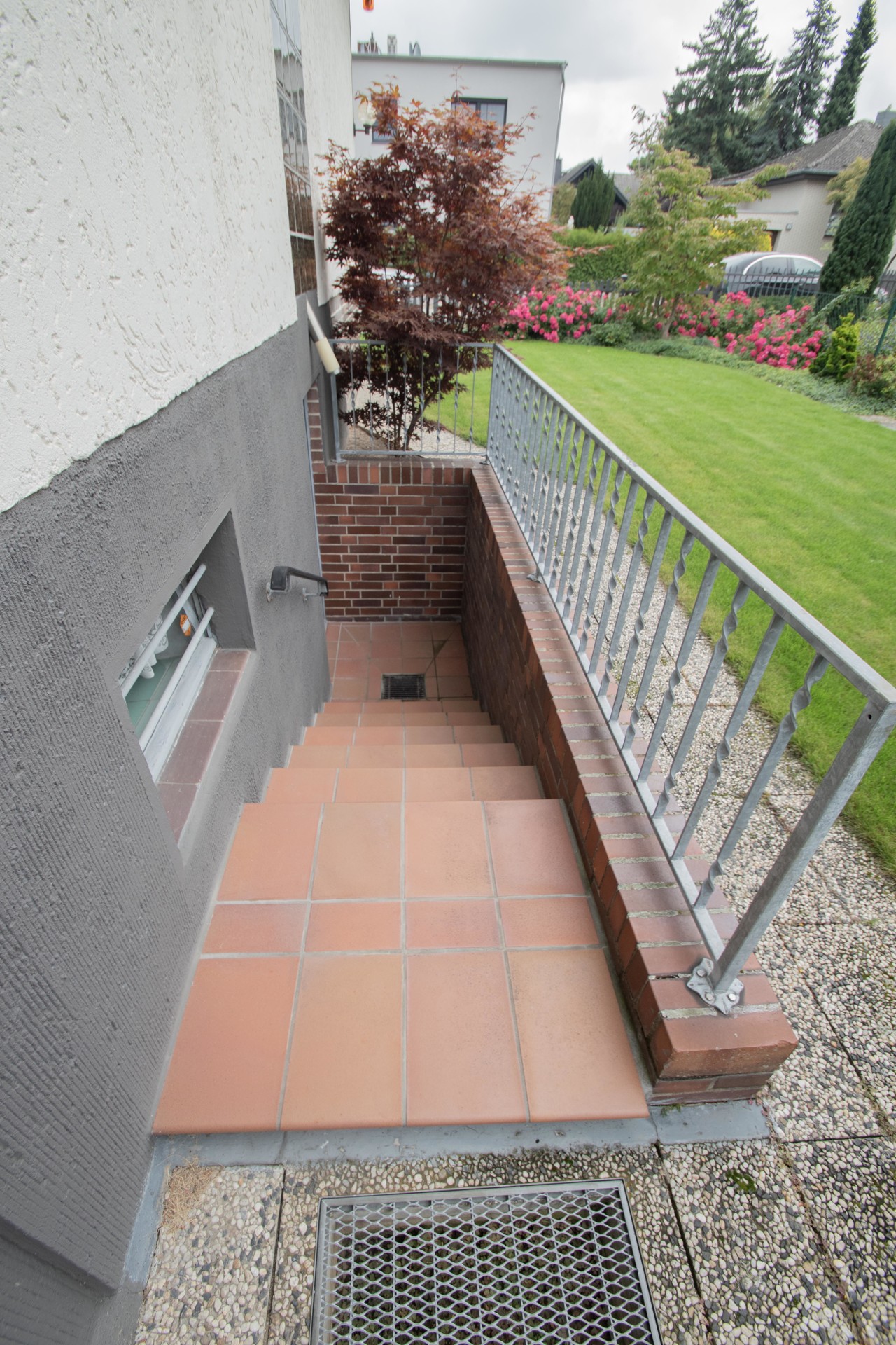 Der Eingang führt über eine Treppe in den Windfang, von dem aus ein kleiner Vorflur in den Keller mit zwei großen Räumen, einem kleinen Bad und einem Heizungsraum führt. Der Hauptflur bietet Platz für eine Garderobe. Geradeaus liegt das Schlafzimmer, während das hellgeflieste Bad mit WC, Waschbecken, Badewanne und einem elektrischen Handtuchheizkörper aufwartet. Rechts vom Flur gelangt man in das lichtdurchflutete Wohnzimmer mit Zugang zur westlich ausgerichteten Terrasse, die mit einer elektrischen Markise ausgestattet ist. Der Kirschbaum im Garten sorgt für Schatten und Blütenpracht.
