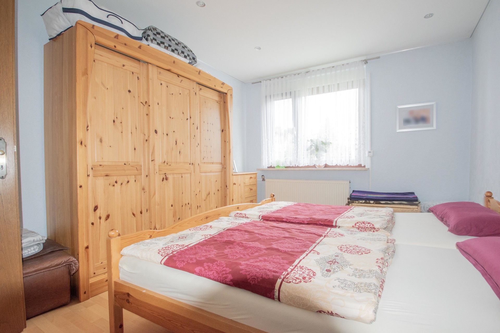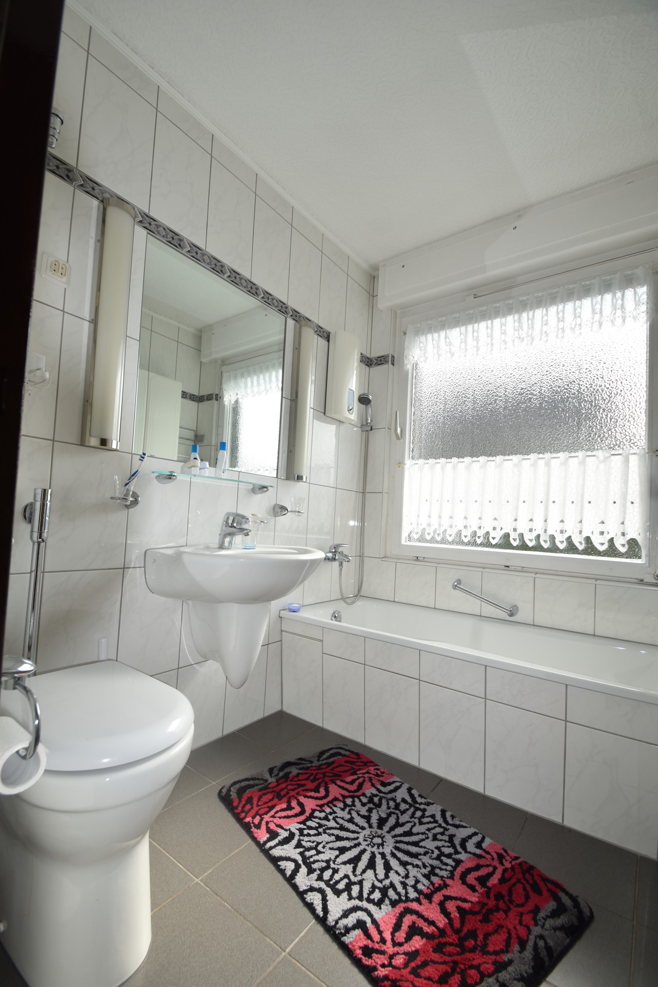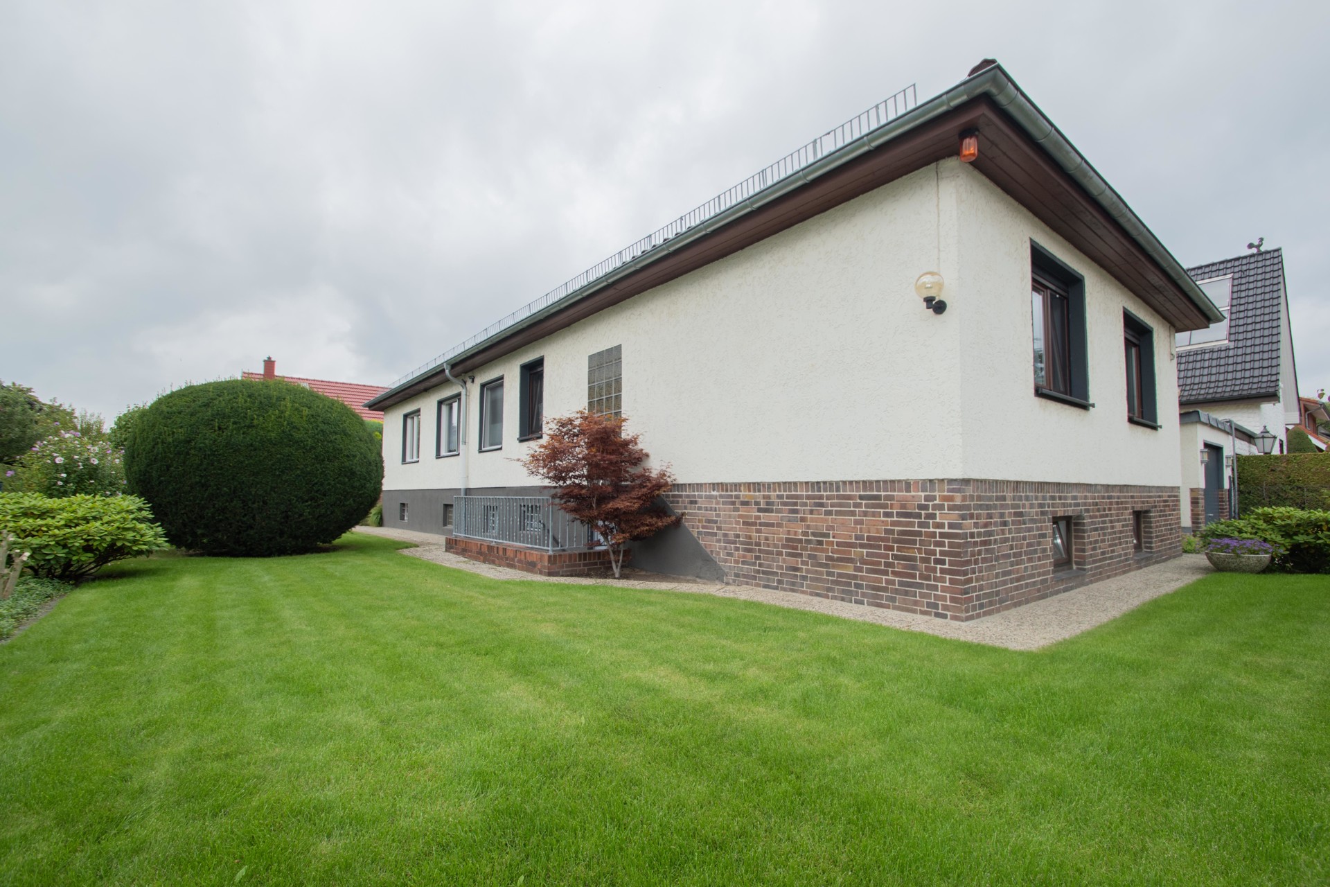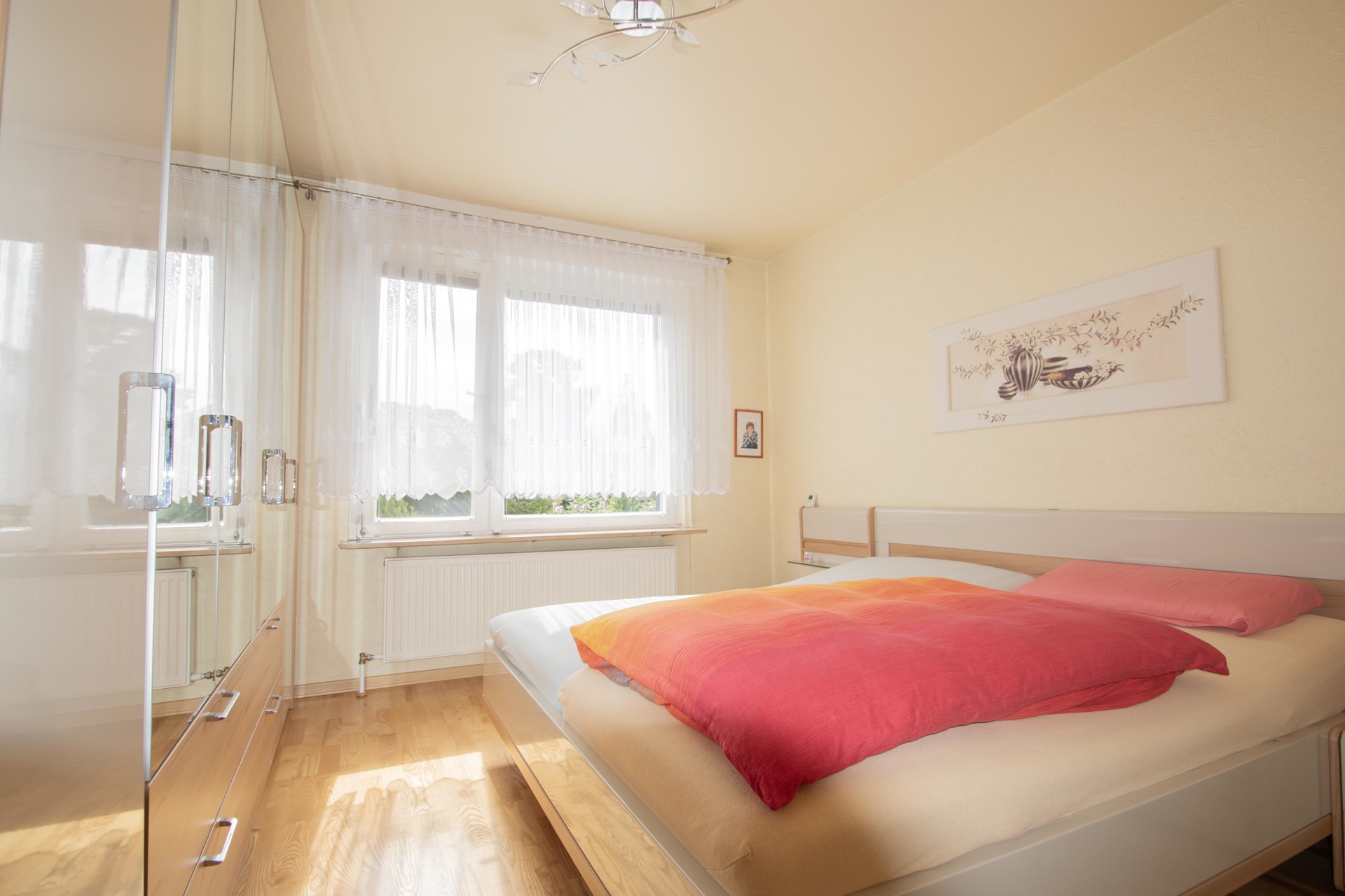 Der Eingang führt über eine Treppe in den Windfang, von dem aus ein kleiner Vorflur in den Keller mit zwei großen Räumen, einem kleinen Bad und einem Heizungsraum führt. Der Hauptflur bietet Platz für eine Garderobe. Geradeaus liegt das Schlafzimmer, während das hellgeflieste Bad mit WC, Waschbecken, Badewanne und einem elektrischen Handtuchheizkörper aufwartet. Rechts vom Flur gelangt man in das lichtdurchflutete Wohnzimmer mit Zugang zur westlich ausgerichteten Terrasse, die mit einer elektrischen Markise ausgestattet ist. Der Kirschbaum im Garten sorgt für Schatten und Blütenpracht.
