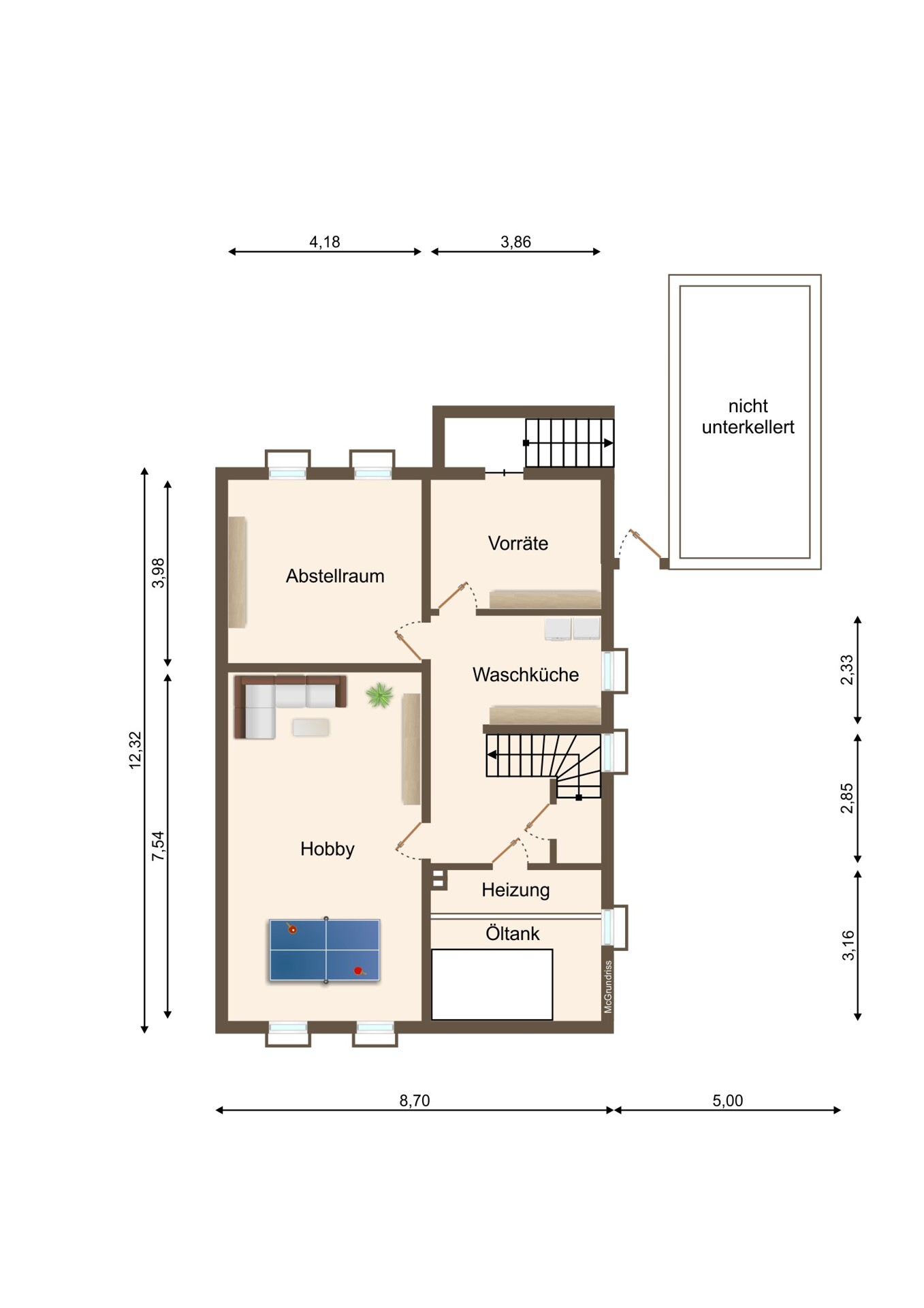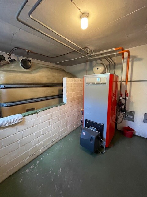 Keller: Der Keller begeistert durch eine beheizbare, große Raumfläche, die sich perfekt als Gästezimmer oder Hobbyraum eignet. Weiterhin gibt es eine Speisekammer, eine Waschküche und einen weiteren Raum mit Zugang zur Kelleraußentreppe in den Garten. Zusätzlich befindet sich der Heizungsraum mit Öl-Heizung hier.