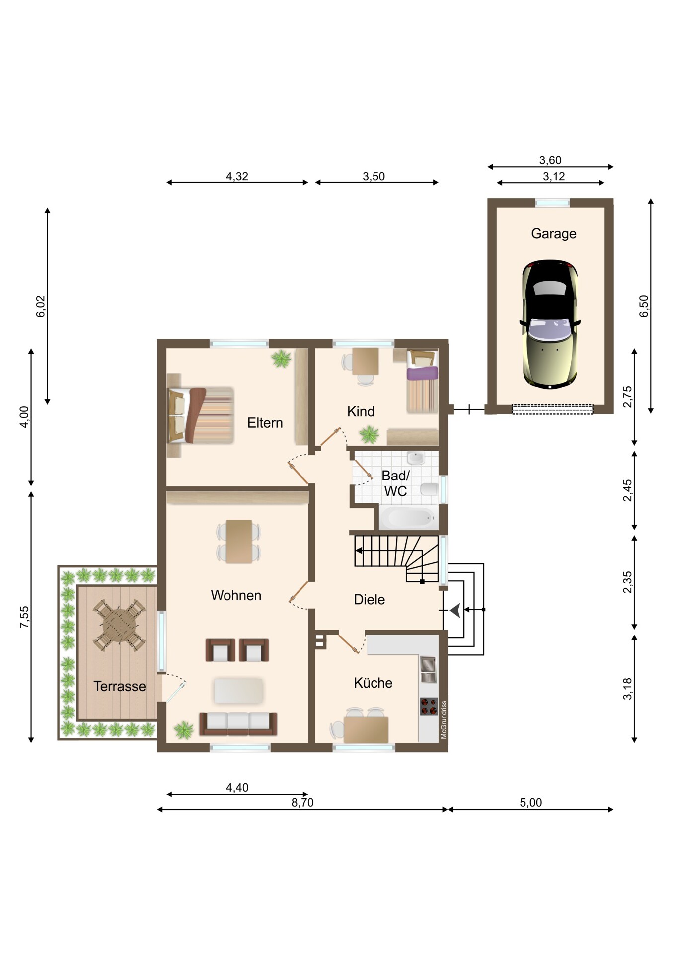 Außenbereich: Der pflegeleichte Garten lädt Familienmitglieder zum Spiel, Toben und Entspannen ein. Abgerundet wird das Angebot von einer Garage mit angrenzendem Abstellraum, die zusätzlichen Stauraum bietet.