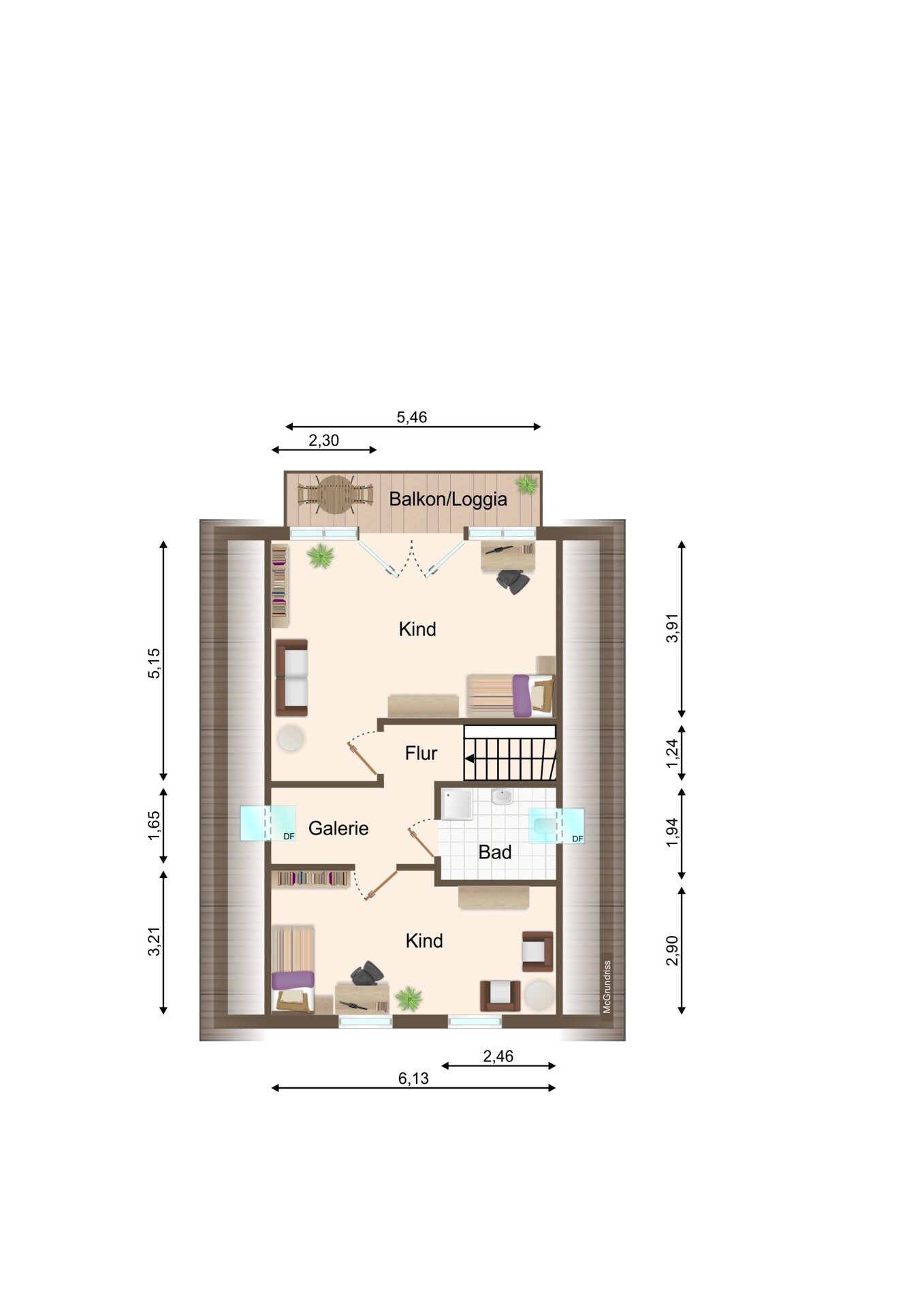 Dachgeschoss: In Leichtbauweise errichtet, beherbergt es zwei großzügige Kinderzimmer – eines mit Zugang zur Terrassentür auf die West-Loggia – sowie ein zwischenliegendes Duschbad. Die Atmosphäre ist hell und großzügig, ideal für Spiel, Lernen und Rückzugsmöglichkeiten.