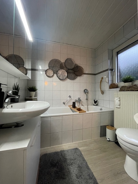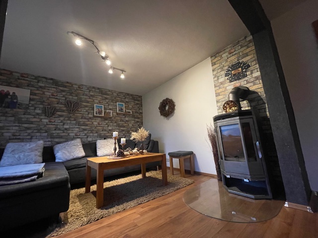 Vom Flur aus gelangen Sie in das großzügige Ess- und Wohnzimmer von rund 31 m², das Ihnen viel Spielraum für Ihre Einrichtungsideen bietet. Hier können Sie gemeinsam mit Ihrer Familie den Kamin genießen (aktueller Zustand: Renovierungsbedarf). Abgerundet wird das Erdgeschoss durch ein Wannenbad.