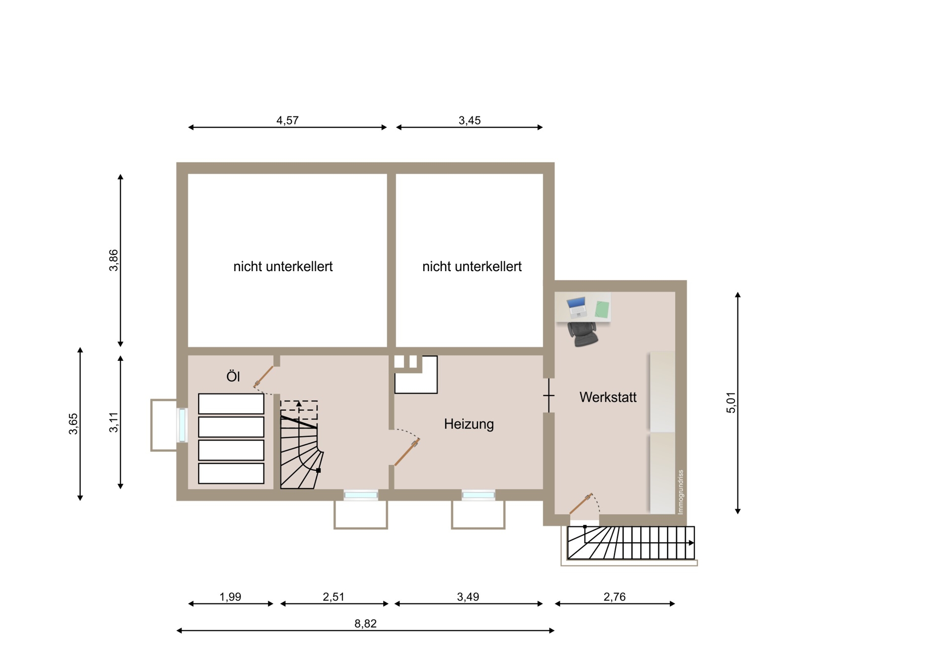 Der Keller ist über eine Steintreppe erreichbar. Dort erwartet Sie zunächst ein Heizungsraum mit einer Ölheizung aus dem Jahr 2007, der ausreichend Platz als Lagerraum für selten genutzte Gegenstände bietet. Der Anbau ist ebenfalls unterkellert und eignet sich hervorragend als Werkstatt; über eine Außentreppe gelangen Sie zum Vorgarten. Ergänzt wird der Keller durch einen Raum mit Öltanks ( Fassungsvermögen ca. 4500 Liter ).