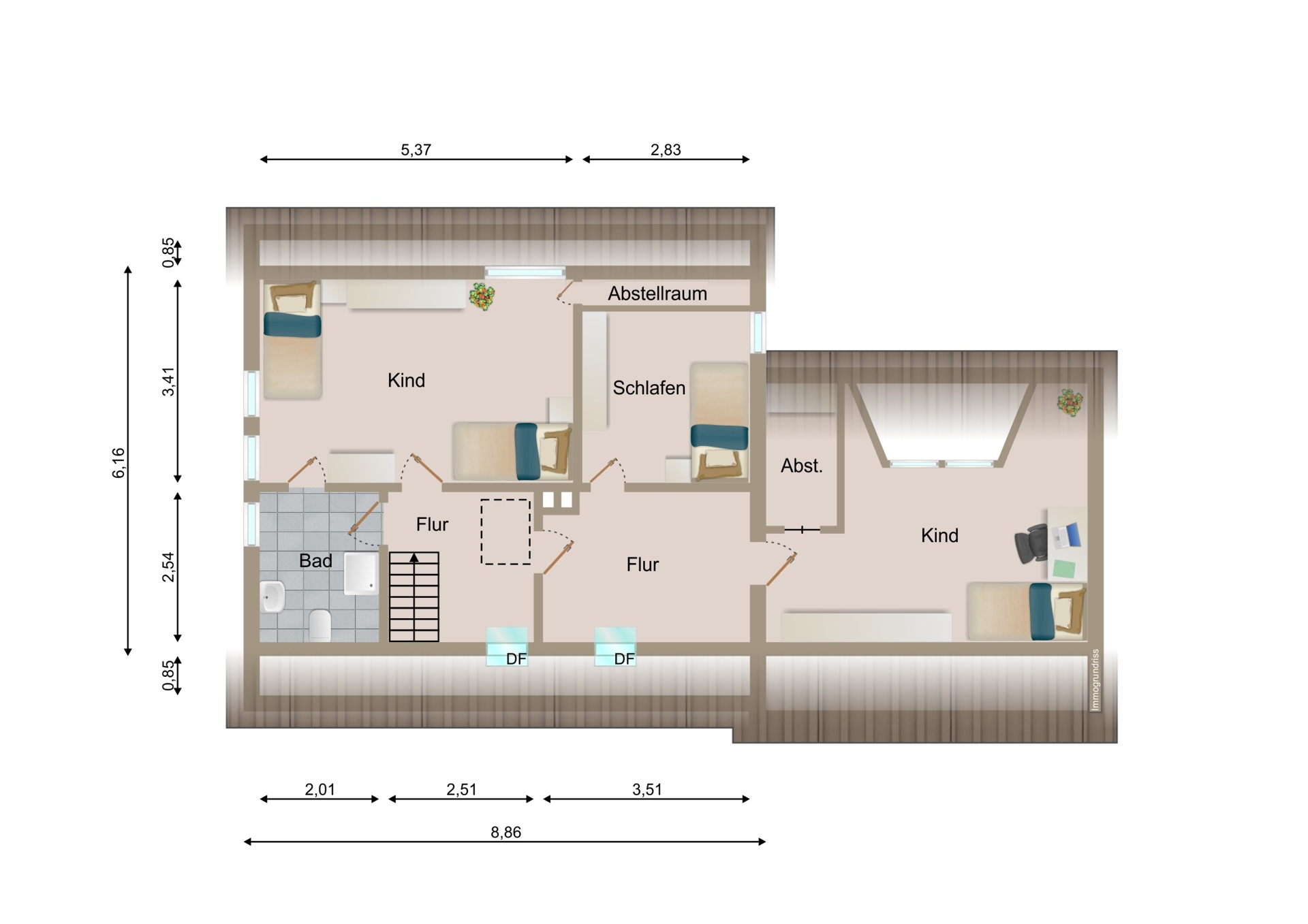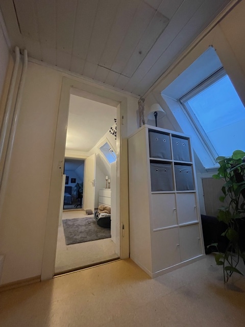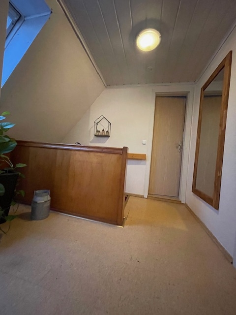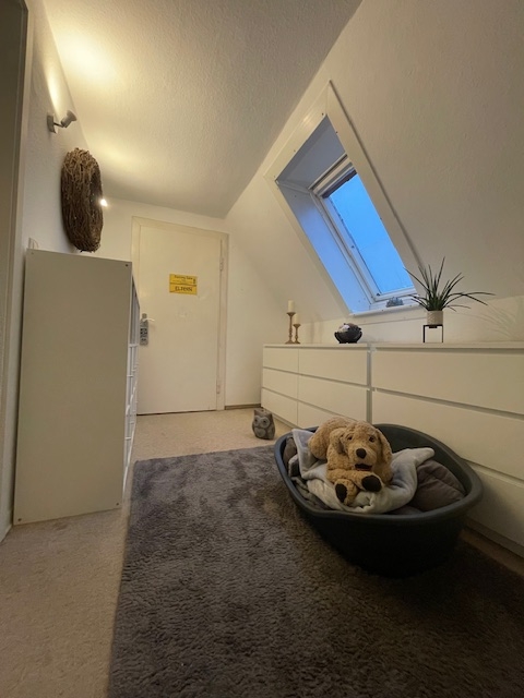 Über eine Holztreppe gelangen Sie ins Dachgeschoss, wo sich drei Schlafräume befinden. Alle drei Zimmer verfügen über Gauben und damit viel Tageslicht. Zusätzlich finden Sie im Dachgeschoss ein charmantes Duschbad aus den Sechzigerjahren. Vom Flur aus gelangen Sie über eine Bodeneinschubtreppe zum Spitzboden, der weiteren Lagerraum bietet.