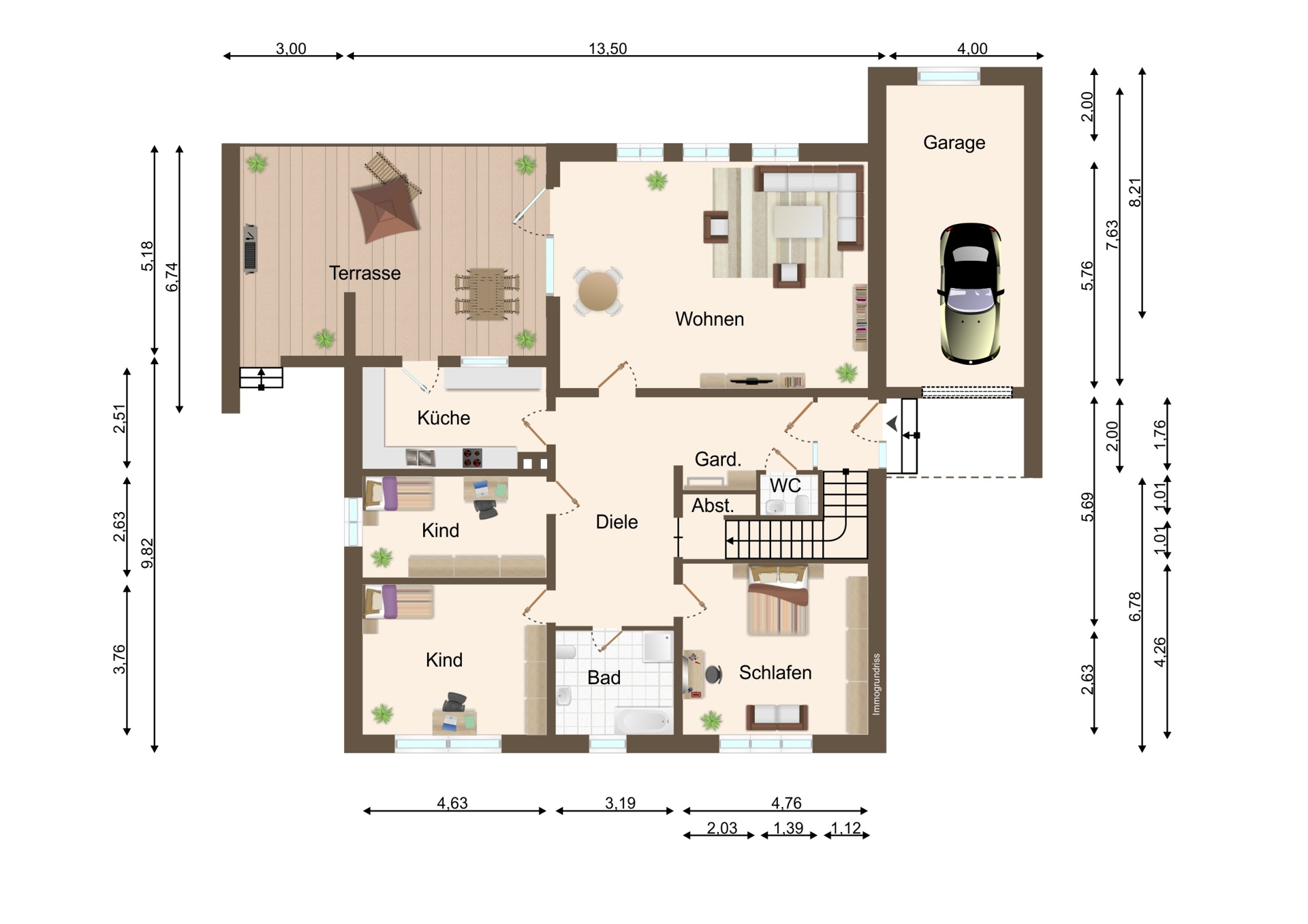 Bereits das Erdgeschoss mit ca. 142 m² Wohnfläche überzeugt durch seine offene und durchdachte Raumaufteilung. Eine geräumige Diele verbindet alle Räume miteinander. Das außergewöhnlich große, lichtdurchflutete Wohnzimmer mit Terrassenzugang bildet das Herzstück des Hauses. Die Küche ist klassisch ausgestattet, verfügt über Fußbodenerwärmung sowie einen weiteren Zugang zur Terrasse mit elektrisch steuerbarer Markise. Zwei Kinderzimmer, ein Schlafzimmer mit Einbauschrank, ein Vollbad mit Handtuchheizkörper und Fußbodenerwärmung sowie ein Gäste-WC mit Urinal lassen im Erdgeschoss keine Wünsche offen.